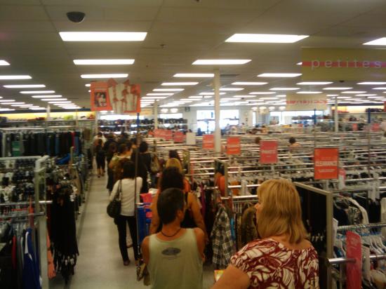 Azok, akik még nem jártak az államokban, a könnyebb megértésért képzeljenek el egy Auchan, vagy Tesco méretű hipermarketet, ahol végeláthatatlan sorokban lógnak mindenféle ruhák, kiegészítők, bőröndök, napszemüvegek, akármik. A termékek elhelyezésére körülbelül akkora gondot fordítanak, mint egy salgótarjáni bálabontó turiban, a vevők pedig a nagybani zöldségpiac hatalmas kosaraira emlékeztető kocsikkal szlalomoznak a cuccok között. Nesze neked butikfeeling!