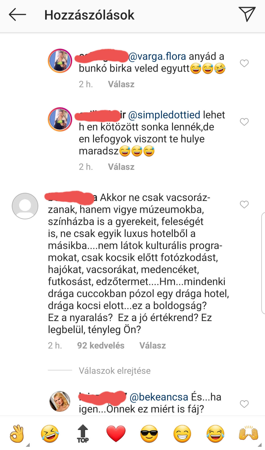 Olyan nímandok szólnak be a családnak a monacói luxusautós, pózer fotók miatt, akik fél lábukat odaadnák egy Rolls Phantommal való képért, ami hosszú évekre a Havanna lakótelep Hörpi büféjének ünnepelt sztárjává tenné a kommentelőt. Vagy amikor #pacalpöri, #véreshurka, #pörc beugat, hogy miért Michelin csillagos étterembe kell vinni a családot?! Na ne legyél má’ álszent, te hova vinnéd, ha megtehetnéd?! És számon kérni a kulturális programok hiányát úgy, hogy egy összetett mondatot nem vagy képes helyesírási hiba nélkül leírni, és a kerületi múzeumba se jutottál el, pedig az számodra évente párszor ingyen van?!